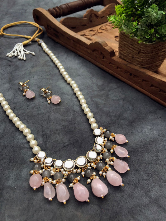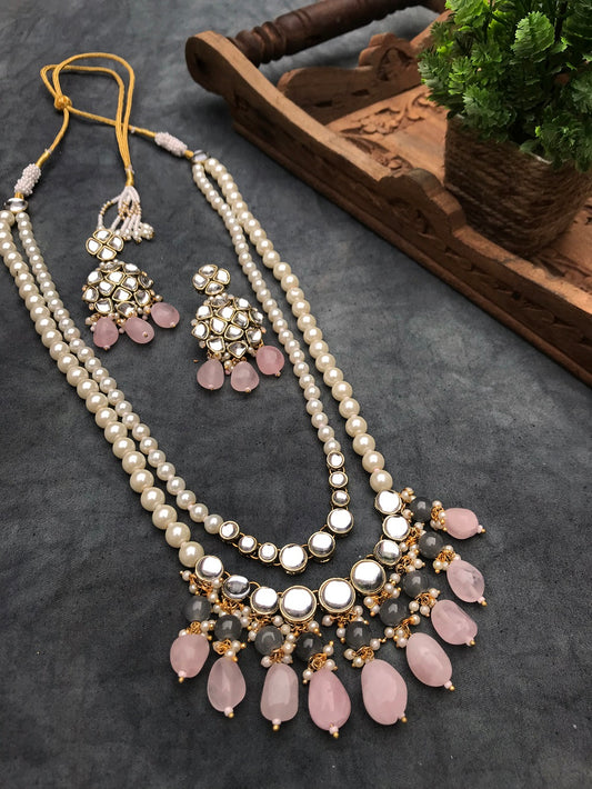 Rose Quartz and Kundan Long Layered Necklace Set