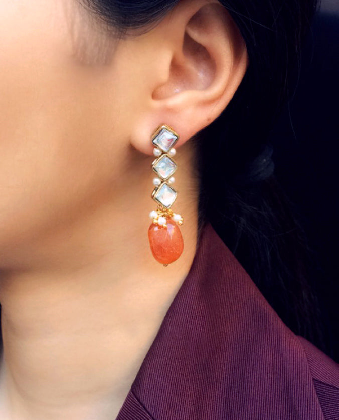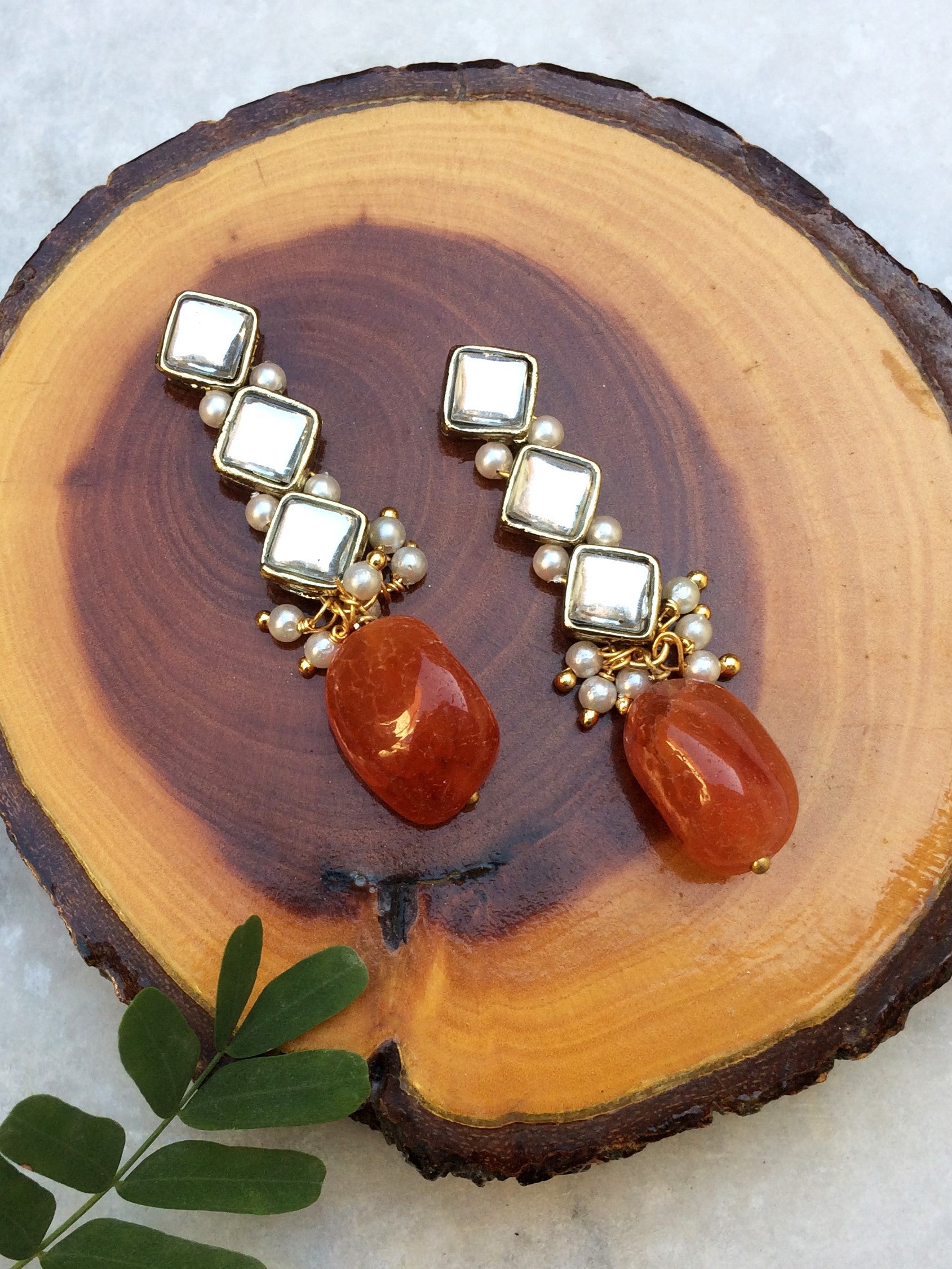 Kundan, natural carnelian stone, faux pearl, glass, and metal