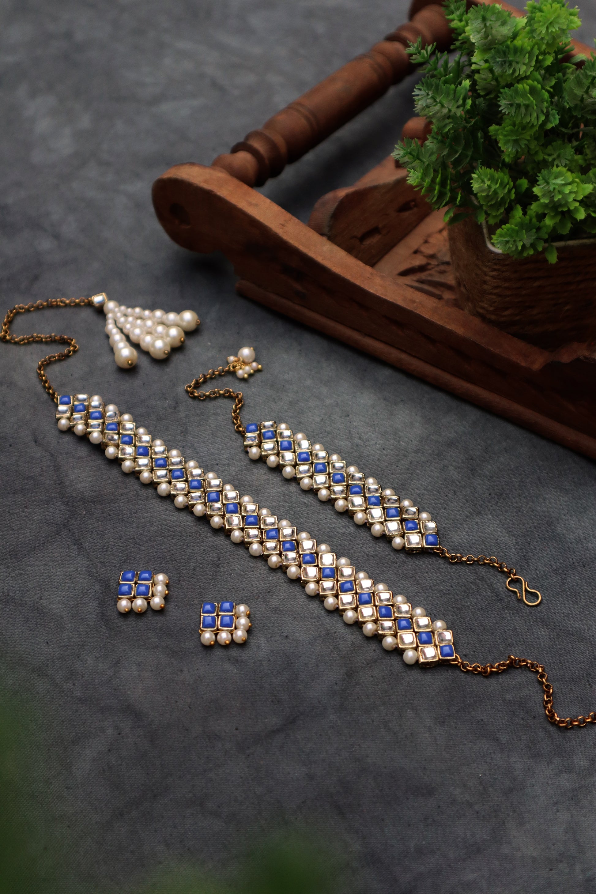 Kundan-Blue Stone Choker Necklace Set With Bracelet
