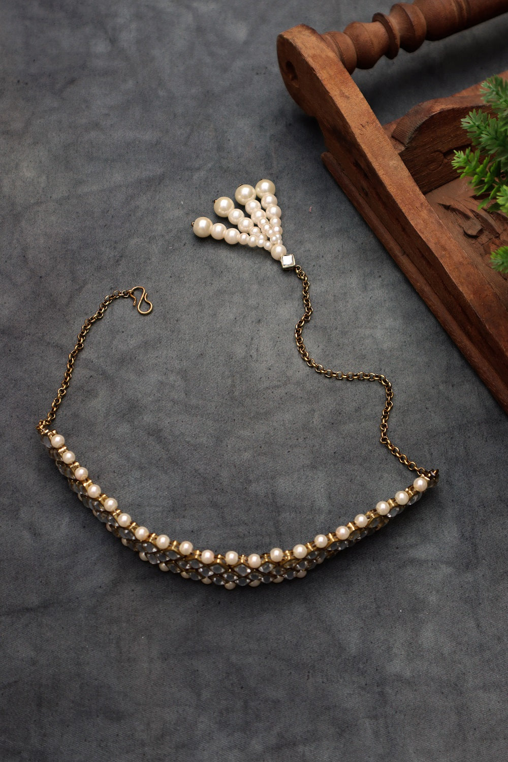 Kundan, faux pearl, glass, and metal