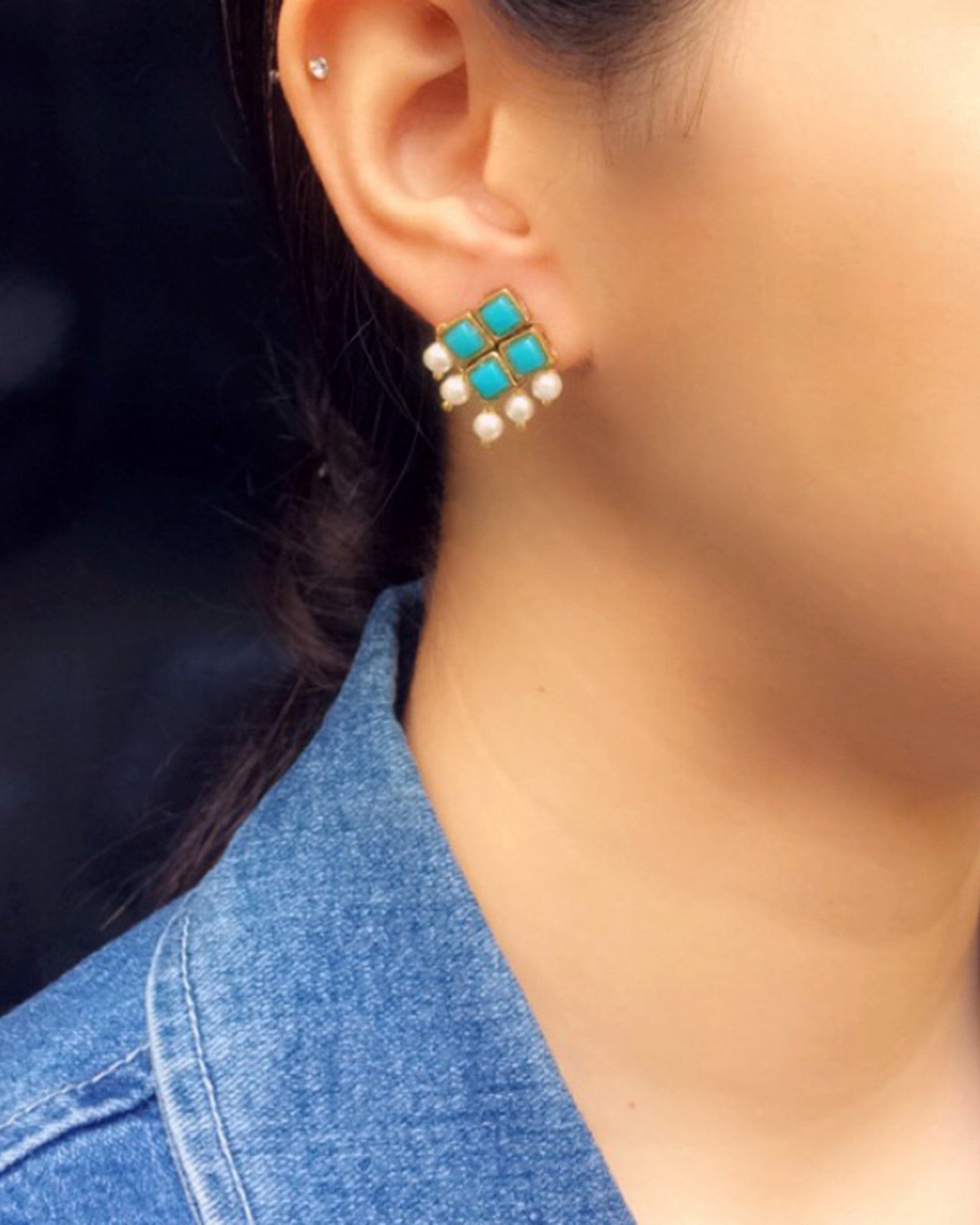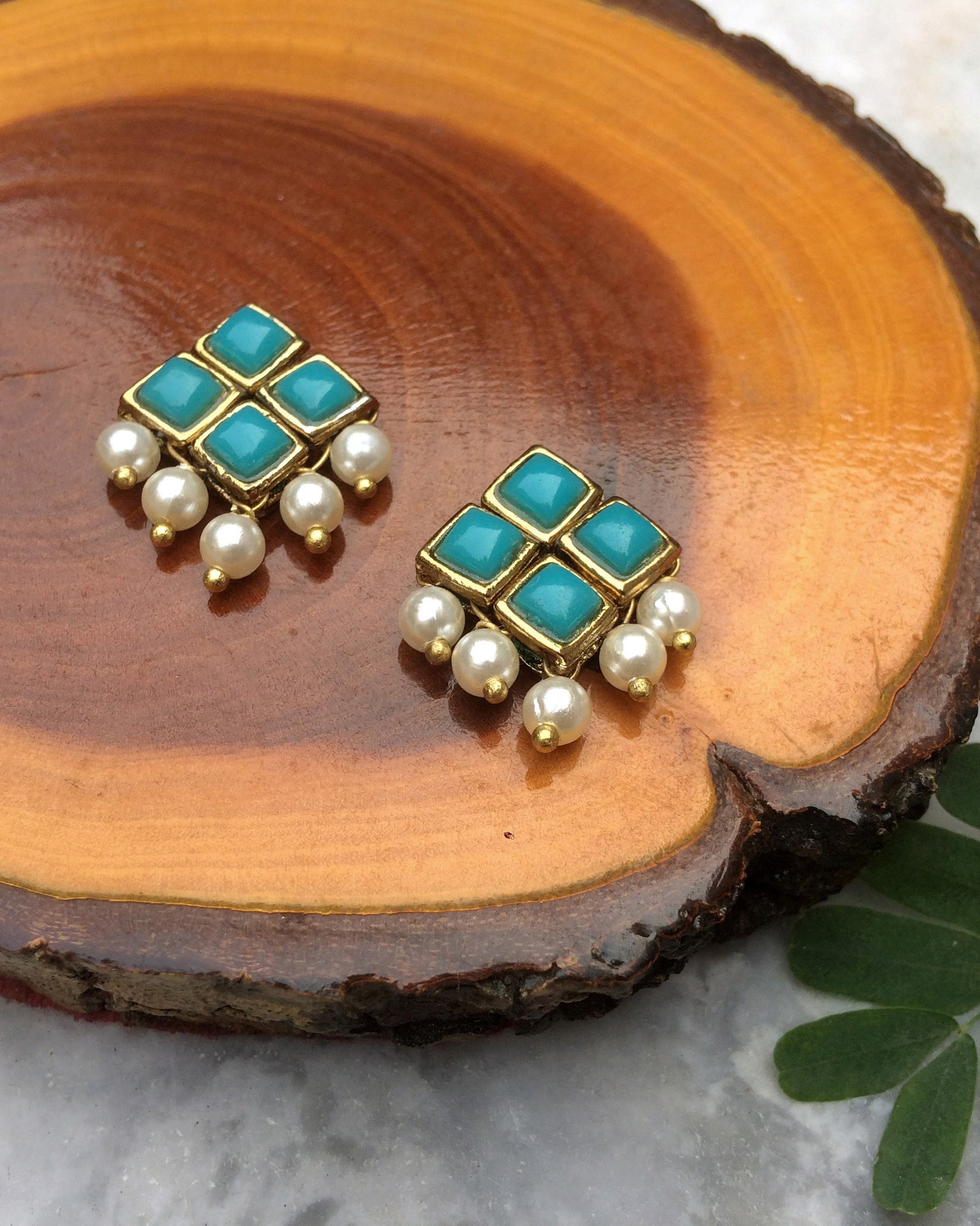 Light Blue Resin Stone and Pearl Stud Earrings