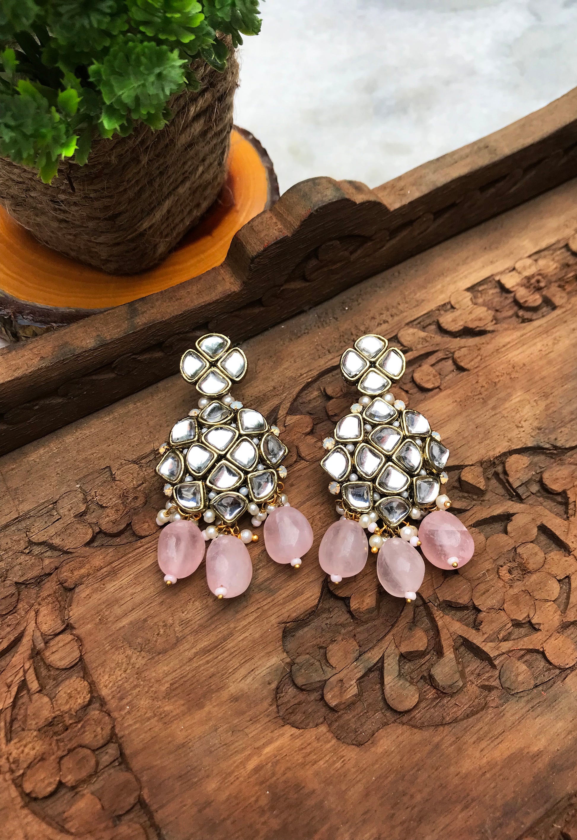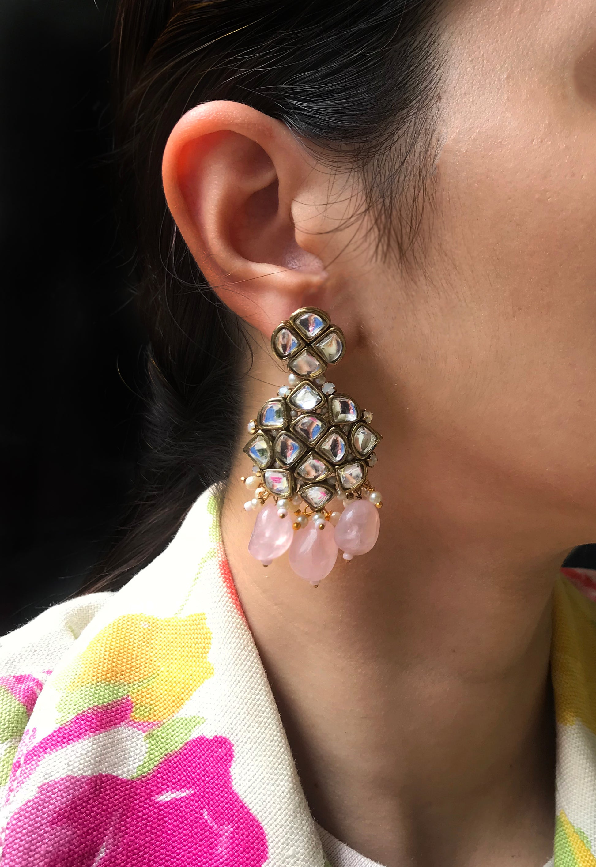 Kundan, natural rose quartz stone, synthetic fire opal stone, faux pearl, metal, and glass