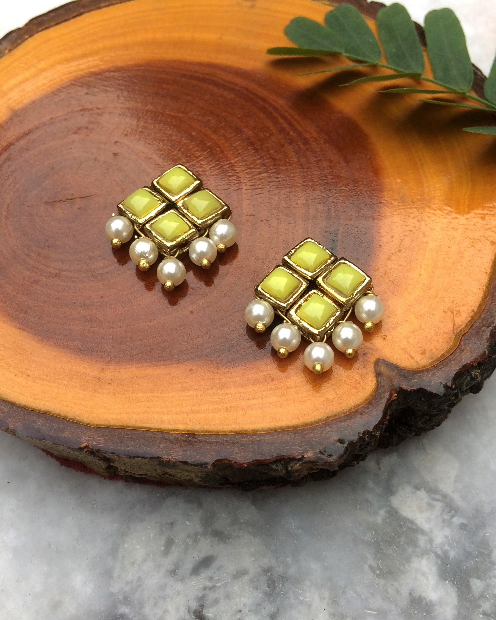 Yellow Resin Stone and Pearl Stud Earrings